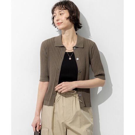 ワイドリブをベースに丁寧に編み立てた、五分袖のポロニットカーディガンです。程よいルーズフィットなサイジングにより、体のラインを拾いすぎず、すっきりと着こなせるのが魅力です。ボタンを留めて一枚着としてプルオーバー風に着るのはもちろん、季節の変わり目の羽織りとしても活躍します。スカートを合わせればレディライクに、マニッシュなパンツを合わせればシックで洗練された印象にと、合わせるボトムス次第で幅広いコーディネートを楽しめます。カラーは、ニュアンス感のあるシックなブラウン(#030)、上品で柔らかな印象のキャメル(#034)、知的で着回しの効くネイビー(#075)の3色展開です。