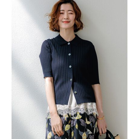 ワイドリブをベースに丁寧に編み立てた、五分袖のポロニットカーディガンです。程よいルーズフィットなサイジングにより、体のラインを拾いすぎず、すっきりと着こなせるのが魅力です。ボタンを留めて一枚着としてプルオーバー風に着るのはもちろん、季節の変わり目の羽織りとしても活躍します。スカートを合わせればレディライクに、マニッシュなパンツを合わせればシックで洗練された印象にと、合わせるボトムス次第で幅広いコーディネートを楽しめます。カラーは、ニュアンス感のあるシックなブラウン(#030)、上品で柔らかな印象のキャメル(#034)、知的で着回しの効くネイビー(#075)の3色展開です。