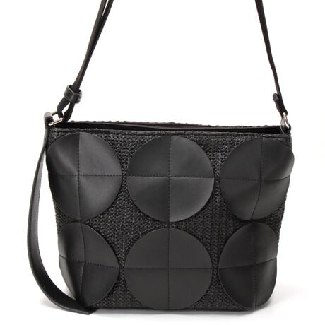 シーズン感のある粗い織り目の厚手素材に、サークル形状のレザーパーツを前面に贅沢に配し、トーン配色でまとめたグラフィカルなテクスチャーバッグシリーズ。