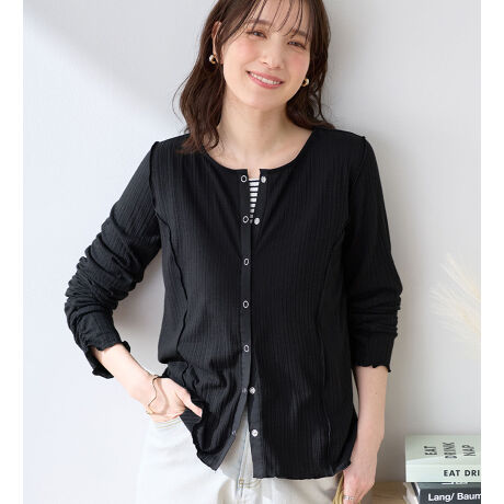 縦見え素材×身頃のパネル切替えですっきり着られます。
