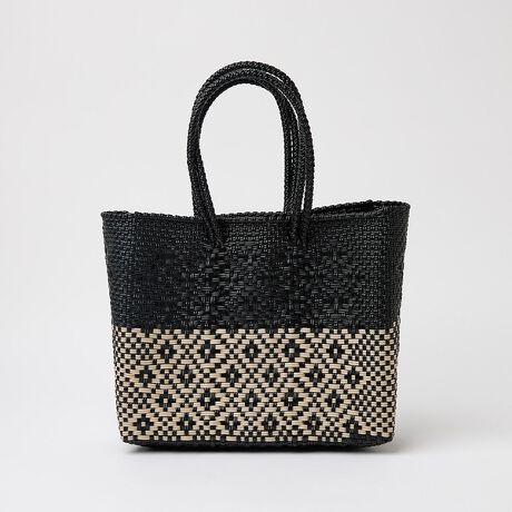 ペットボトルから再利用されたリサイクルプラスチックのメルカドバッグ。こちらはちょっとしたお出かけや旅行中の現地利用に便利なSサイズ。小さくてもはっきりとした配色で、コーデのポイントになるデザイン。間口が広いので荷物が入れやすく、丈夫なプラスチック紐を使用しているので、汚れた際のお手入れも簡単。雨の日の気兼ねなく使えるので、デイリー使いに最適です。環境に配慮しながら、本格的なメキシカンカゴバッグの要素をポイントに取り入れて春夏気分をアップ!