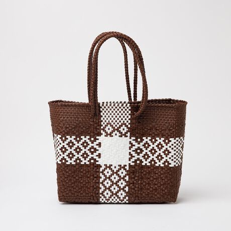 ペットボトルから再利用されたリサイクルプラスチックのメルカドバッグ。こちらはちょっとしたお出かけや旅行中の現地利用に便利なSサイズ。小さくてもはっきりとした配色で、コーデのポイントになるデザイン。間口が広いので荷物が入れやすく、丈夫なプラスチック紐を使用しているので、汚れた際のお手入れも簡単。雨の日の気兼ねなく使えるので、デイリー使いに最適です。環境に配慮しながら、本格的なメキシカンカゴバッグの要素をポイントに取り入れて春夏気分をアップ!