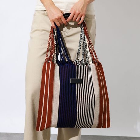 MOON BIRDの手織りハンモックトート。丈夫で軽やかなコットン素材、たっぷり収納と折り畳み可能なデザイン。普段使いから海やアウトドア、フェスまで、あらゆるシーンを彩る一点です。※人の手で一つ一つ丁寧に作られているハンドメイドバッグは、メキシコの先住民が細い糸を手で織って製作した伝統工芸品の織物を使用。