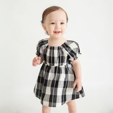 清楚なスクエアネックと、ぷっくりとしたパフスリーブが、ベビーの可愛らしさを最大限に引き立てます