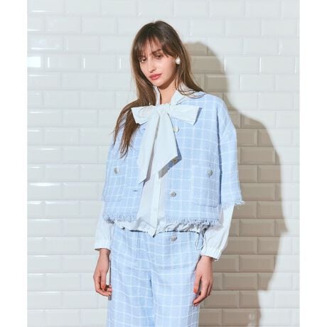 表情感のあるチェックツイード地のノーカラーハーフスリーブジャケット。