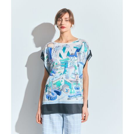 [型番:0226241008]イタリアの老舗布地メーカーRATTI(ラッティ)社の美しいスカーフプリントを全面に使用した、パネルプリントのツイルポンチョトップス。※こちらのモデル着用画像はサンプル品を撮影しております。実際の商品と仕様、加工、サイズが若干異なる場合がございます。予めご了承くださいませ。