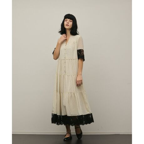 シフォンドットジャガード素材を使用したカフタンワンピース。ギャザー分量をたっぷり入れ、生地を贅沢に使用。袖口と裾のレースが軽やかさ感じるデザインがポイント。