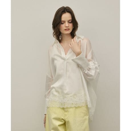 シアー素材のスキッパープルオーバーシャツ。ビックシルエットで肩のギャザーと裾のレースが優しい印象を与えるデザインがポイント。