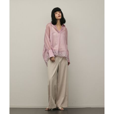 [型番:0326241337]シアー素材のスキッパープルオーバーシャツ。ビックシルエットで肩のギャザーと裾のレースが優しい印象を与えるデザインがポイント。※こちらのモデル着用画像はサンプル品を撮影しております。実際の商品と仕様、加工、サイズが若干異なる場合がございます。予めご了承くださいませ。