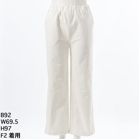 しっかりとした厚みのあるホワイトデニムで、透けにくく安心感のある穿き心地。横と斜め方向にしっかり伸びるストレッチ性で、動きやすく快適です。