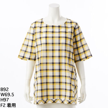 イエローのチェック柄がコーディネートに明るさをプラス。切替デザインで柄に変化をつけ、シンプルながらも表情のある一枚に仕上がっています。