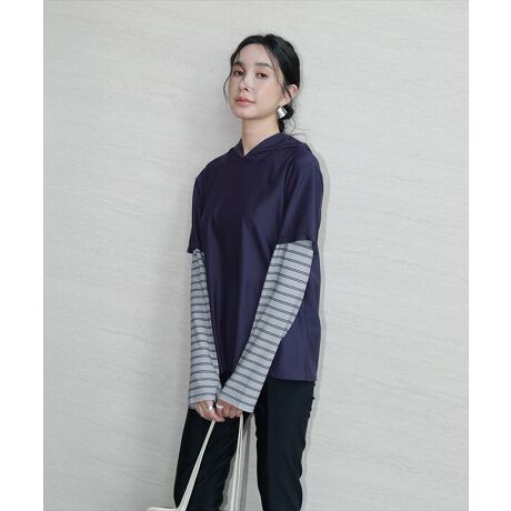 長袖と半袖のレイヤード風デザインのラッシュガードは実際には1枚の長袖トップスになっており、紫外線カット率99%以上のUVカット生地。