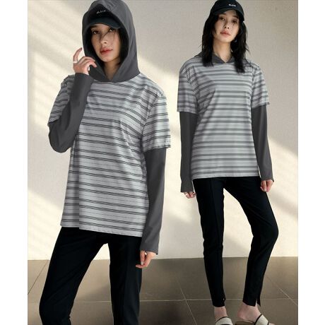 長袖と半袖のレイヤード風デザインのラッシュガードは実際には1枚の長袖トップスになっており、紫外線カット率99%以上のUVカット生地。