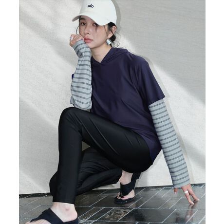 長袖と半袖のレイヤード風デザインのラッシュガードは実際には1枚の長袖トップスになっており、紫外線カット率99%以上のUVカット生地。