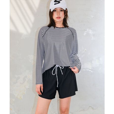 強い日差しから肌を守るラッシュガードは、細いボーダー柄タイプとマリンテイストなボーダー柄の2タイプ。