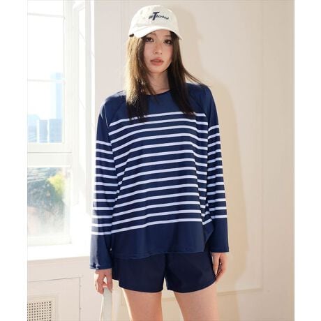 強い日差しから肌を守るラッシュガードは、細いボーダー柄タイプとマリンテイストなボーダー柄の2タイプ。