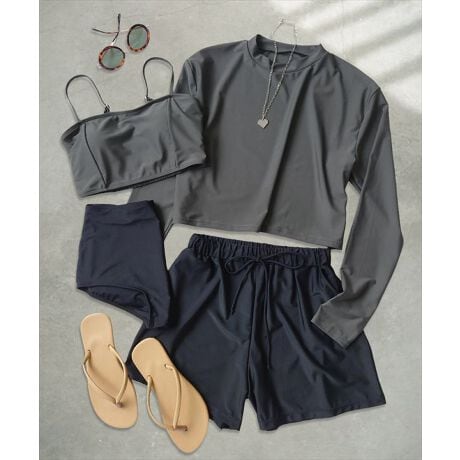 ラッシュガード、ビキニ、ショーツ、ショートパンツの4点セットです。