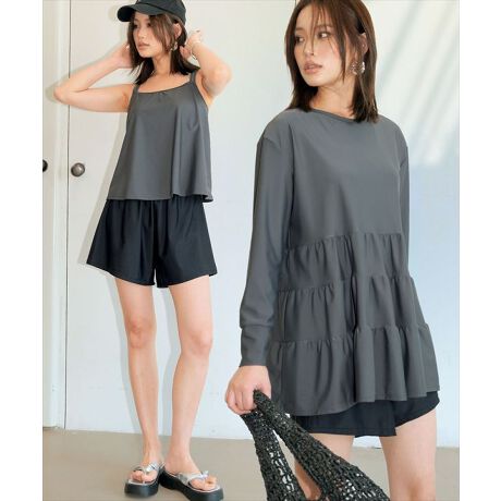 ティアードフリルのトップスとキャミソールビキニ、ショーツ、ショートパンツの4点セット水着。