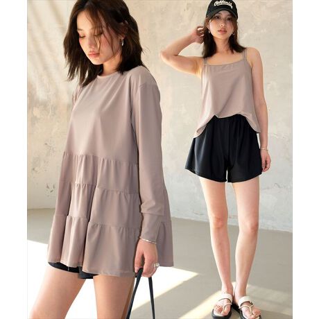 フレアに広がった長袖ラッシュガードはチュニック丈になっており、ラフな着やすさが◎