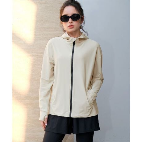 ファスナーを上まで閉めると首元もしっかり覆うハイネックデザインで、本気の日焼け対策に向いています。