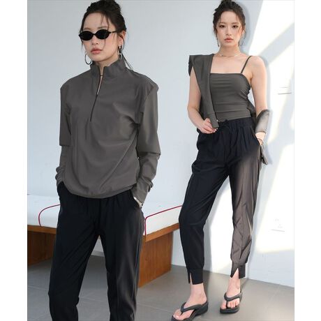 ラッシュガード、キャミビキニ、ショーツ、パンツの4点セットです。