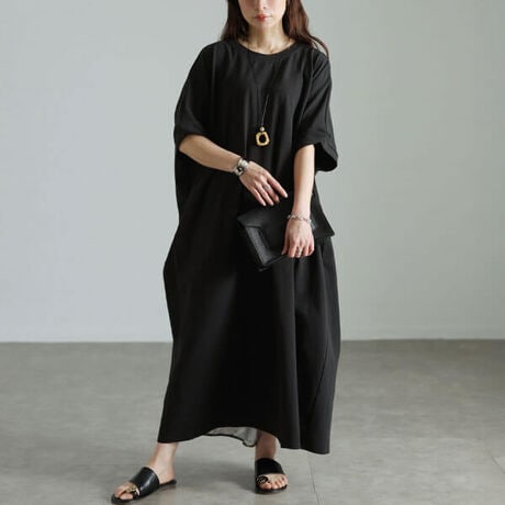 後ろ姿まで印象的☆後ろリーフ柄切り替えドルマンワンピース隠したい体型を一枚着るだけでまるごとカバーできるゆったりドルマンシルエット♪バストにゆとりのある設計で大きめバストの方も楽ちんな着心地◎広がりすぎないシンプルなシルエットで動きやすい♪綿混カットソーワンピに後ろリーフ柄切り替え合わせた存在感溢れる一着です☆