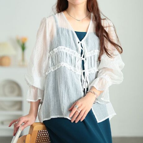 軽やかで爽やかな透け感が魅力のシアーカーディガン。楊柳ならではのストライプ柄がこなれた雰囲気。胸元のギャザーフリルがバスト位置をマーク。ゆったりシルエットでもメリハリのあるコーデが完成。バックスタイルにもギャザー入りなので後ろ姿も◎。春夏の紫外線対策、体温調節にもおすすめ。柔らかなニュアンスを引き立てる今どきカーディガンです。