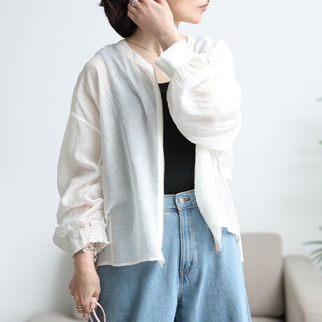 透け感のあるシアー素材とメッシュを組み合わせた、軽やかな着心地のブルゾン。前身頃と袖外側は柔らかなシフォン、背中や袖内側には通気性の良いメッシュを使用し、見た目も着心地も涼やかに仕上げました。軽くて持ち運びもしやすく、日差し対策や冷房対策にもぴったりな一着です♪