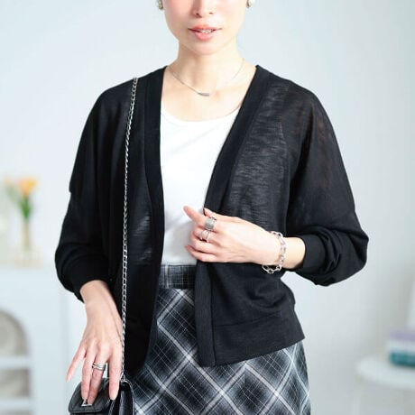 どんなコーデにも馴染むシアースラブクロップドボレロ☆大人気クロップド丈アイテムから待望のカーディガン登場!クロップド丈でワンピ・スカート・パンツ何と合わせてもGOODバランスにコーデがキマる♪ゆったりシルエットのトッパーデザインなのでバストが大きめの方も安心◎ナチュラルな透け感と抜け感のある後ろ姿で季節感高まる装いに!夏場は紫外線・冷房対策アイテムとしても◎