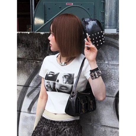 印象的なリップフォトプリントにストーンをあしらったTシャツ。