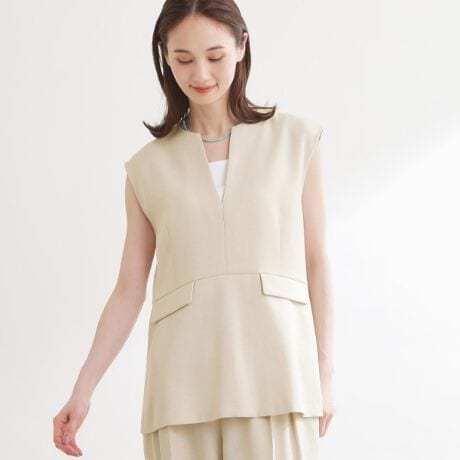 裾に入れたペプラム風の切り替えが立体感と柔らかなニュアンスを生み出し、すっきりとしたネック周りとノースリーブデザインでインナーとのレイヤードも楽しめ大人の抜け感を備えたデザインです。
