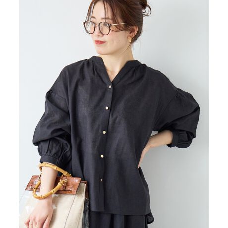 スタンドカラーの首元にギャザーを入れ、控えめな華やかさをプラス。