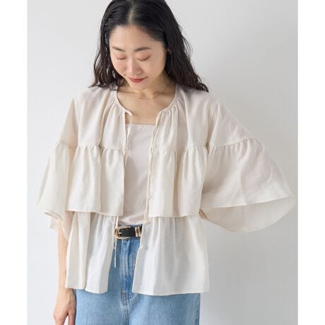 揺れ感のあるシルエットに二の腕をすっぽり覆う袖丈で柔らかく女性らしい雰囲気に仕上がります。