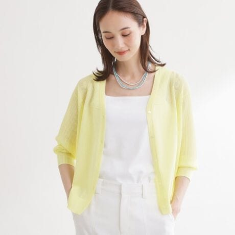 すっきりとしたVネックでワンピースやブラウスの上にも羽織りやすく、スカートはもちろん、パンツスタイルにもバランスよく合わせていただけます。