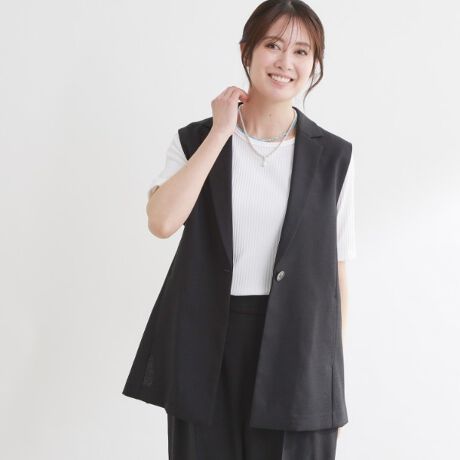 フロント一つボタンのすっきりとしたデザインで、縦のラインを美しく見せるバランスの軽やかに羽織れるジレ。