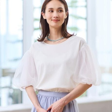 ふんわりとしたボリュームスリーブがシンプルな身頃に華やかさをプラスしてくれます。