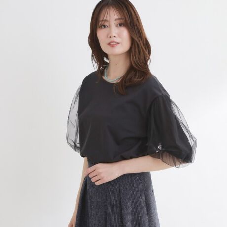 ほどよいハリ感のあるポンチ素材に軽やかなチュール袖を組み合わせたデザインプルオーバー。