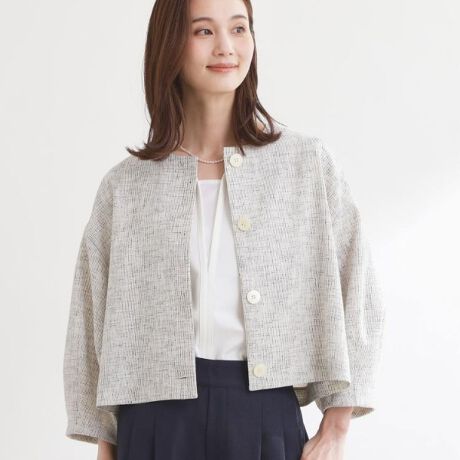大きめサイズのボタンと短めの着丈が軽やかな印象のコンパクトなノーカラージャケット。