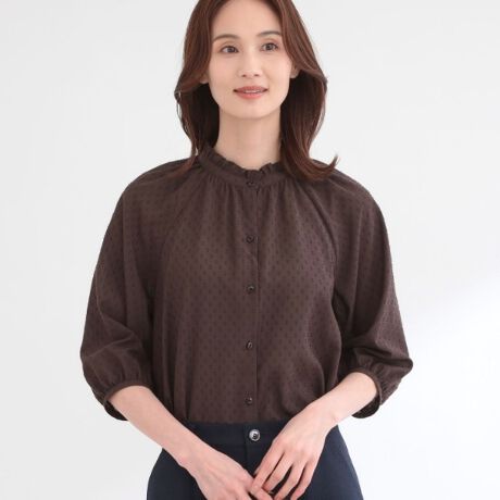 衿ぐりにたっぷりとギャザーを寄せた、華やかな印象のブラウス。