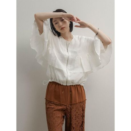 しなやかで軽やかなシアー素材を使用し、ふんわりとした切り替えデザインが印象的なジップブルゾン。
