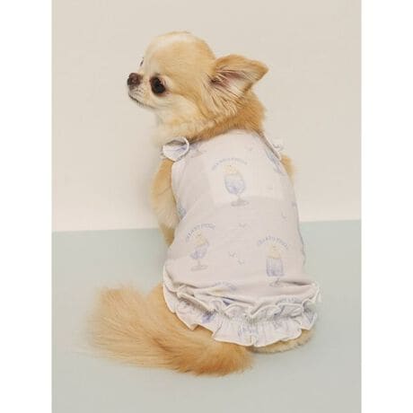 小さなフリルの裾と、くしゅっとギャザーを寄せた肩紐がキュートな接触冷感素材のプルオーバーです。シロクマをモチーフにした夏らしいひんやりスイーツの絵柄を総柄プリント。背中に保冷剤を入れられるポケット付きで、暑さが気になる日のお散歩やお出かけにも重宝します。色は爽やかなピンクとブルーの2色展開。きょうだいで色違いコーディネートもおすすめです。