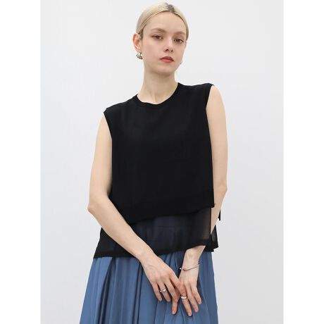 マットな質感のニット地と、シースルー生地のドッキング素材。同じ色味の異なる素材を重ねることで、単色の中にも陰影や凹凸感のある魅力的な表情に。柔らかくさらりとした素材感で、女性らしく軽やかな印象を与えます。