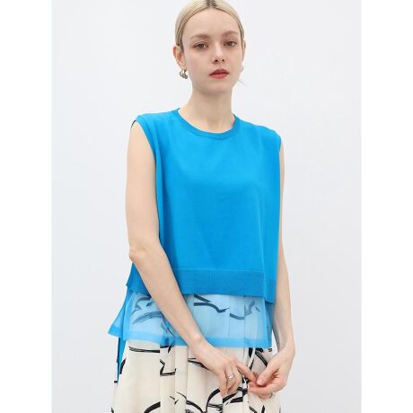 マットな質感のニット地と、シースルー生地のドッキング素材。同じ色味の異なる素材を重ねることで、単色の中にも陰影や凹凸感のある魅力的な表情に。柔らかくさらりとした素材感で、女性らしく軽やかな印象を与えます。