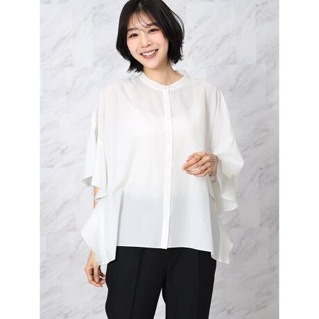 バンドカラーの衿元が顔まわりをすっきりと見せ、フリルスリーブと相まって爽やかな女性らしさを引き立てます。