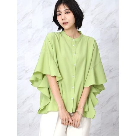 バンドカラーの衿元が顔まわりをすっきりと見せ、フリルスリーブと相まって爽やかな女性らしさを引き立てます。