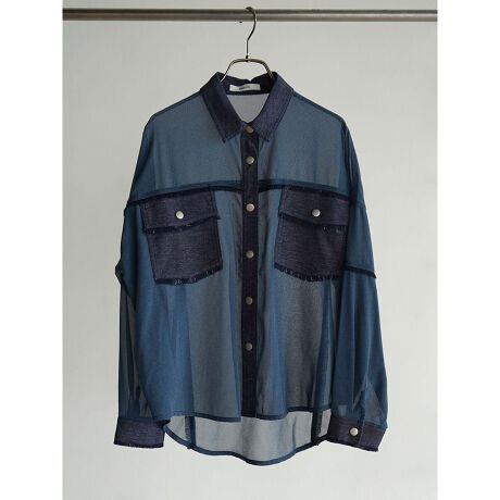 シアー×デニムの異素材切り替えが目を惹く、清涼感のあるブラウス。