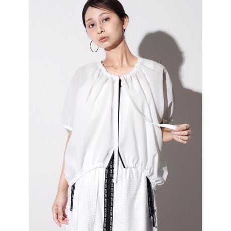 ふんわりとしたギャザーディティールとドルマンスリーブが印象的なジップアップブルゾン。