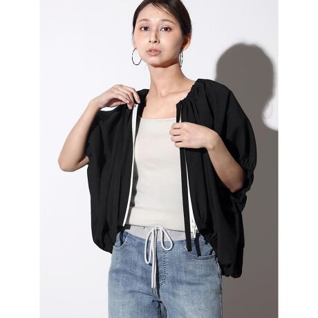 ふんわりとしたギャザーディティールとドルマンスリーブが印象的なジップアップブルゾン。