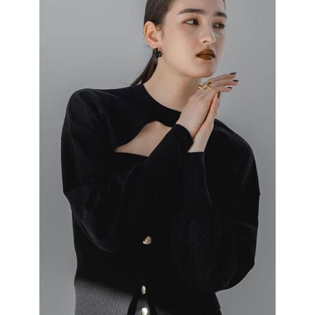 肩ラインを覆う華麗なカーブラインが女性らしいあしらいをデザインしたニットスリーブ。袖のリブがゆとりある袖のフォルムをバランスよく締め、メリハリのある一着に。レイヤードに華が咲き、フォーマルからオケージョンまで幅広く着こなしていただける逸品です。