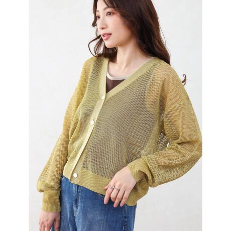透け感のあるメッシュ素材にきらっと光るラメが華やかなカーディガン。